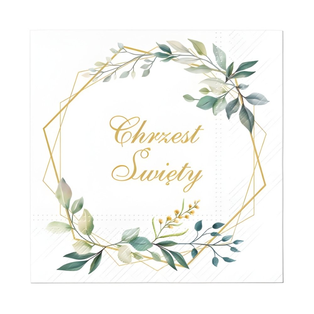 Eleganckie, okazjonalne serwetki papierowe ozdobione delikatnym motywem zielono-złotych listków, idealne na uroczystość Chrztu Świętego.