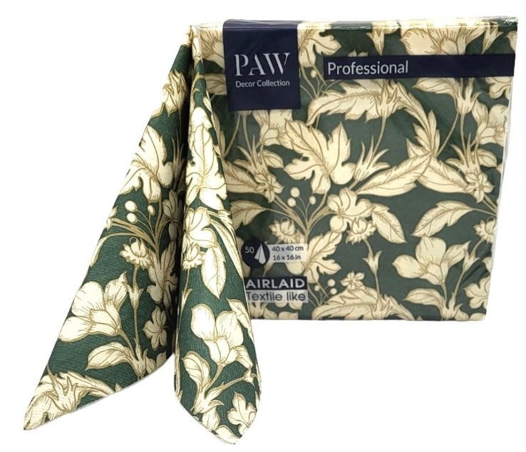 Flizelinowe serwetki z eleganckim zielono-złotym nadrukiem, wykonane z wysokogatunkowej bibuły airlaid. Charakteryzują się miękkością oraz strukturą przypominającą serwetki bawełniane. Doskonale nadają się do formowania różnorodnych kompozycji, stanowiąc efektowną dekorację każdego stołu.